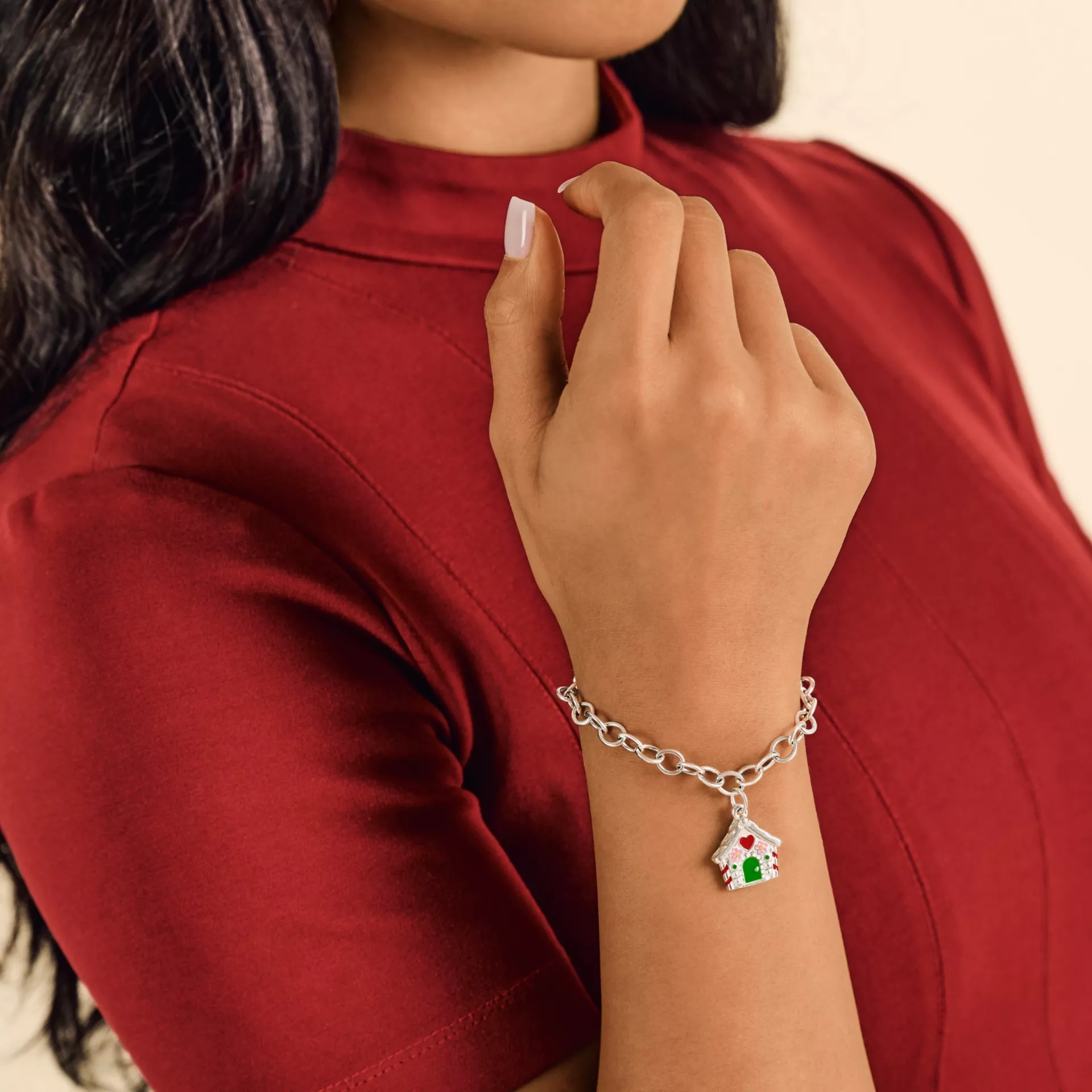 Reminiscent of a heartwarming Christmas pastime tradition, our Enamel Gingerbread House Charm is as sweet as can be. Hand-enameled in classic holiday colors of red and green with pops of pink and yellow, this cottage-style design features hearts, flowers and peppermints. Uniquely adorned on both sides so you get a merry look either way it’s turned while dangling from a bracelet or necklace. This sterling silver charm makes a whimsical addition to your holiday charm collection.
